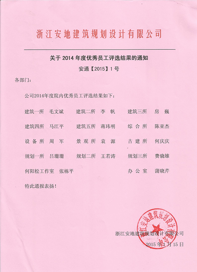 关于2014年度优秀员工的评选结果通知