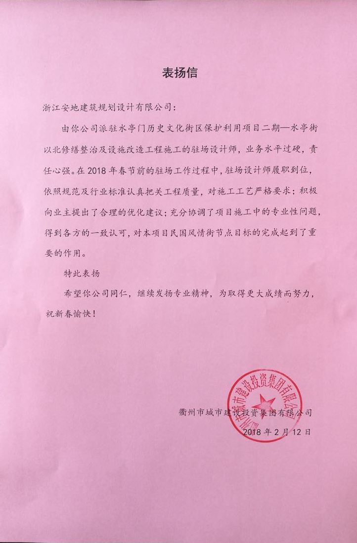 今日,我公司收到衢州市城市建设投资集团有限公司的表扬信,表扬我公司驻派水亭门历史文化街区保护利用项目二期的驻场设计师业务水平过硬,责任心强。