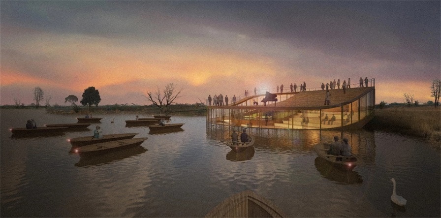 Jose接着介绍了与本公司禾下合作的一个景观建筑。在湖边是怎么看天鹅的?仗着自己个子高、块头大,所以压倒性的俯视它们吧?MADAM告诉你,我们是平等的,所以应该平视!于是天鹅湖的小看台被设计成一半浸入水中,这样你就只能和它们平等地对视,听起来就挺好玩的,我猜天鹅也是这么想的~