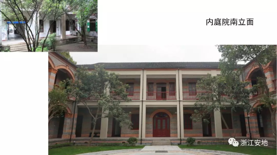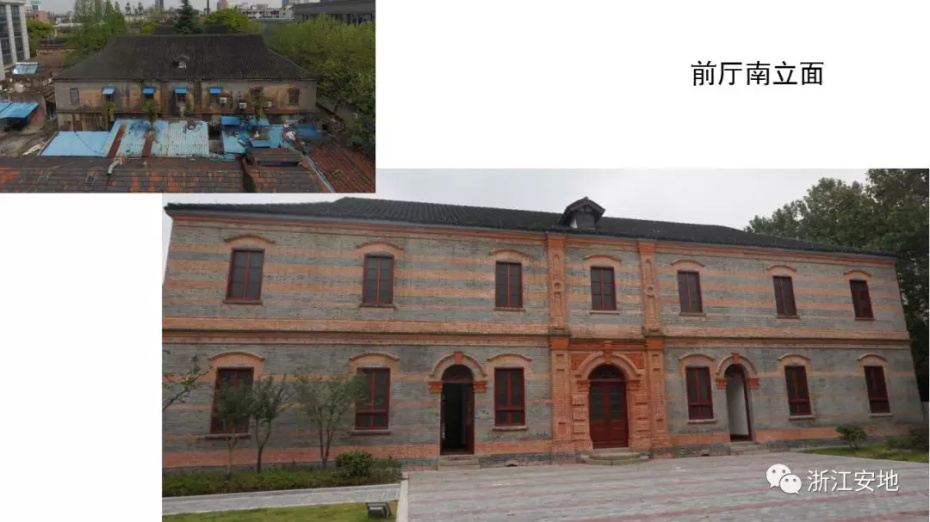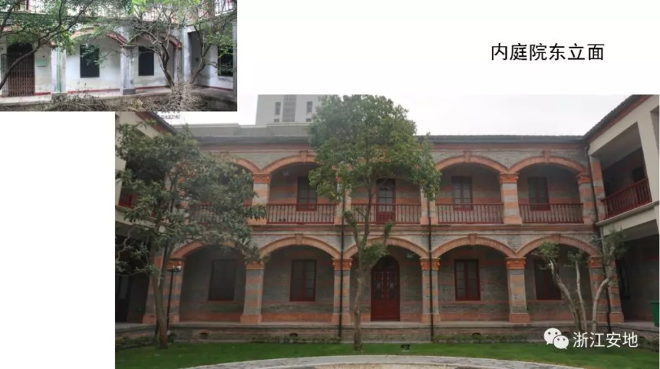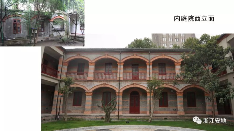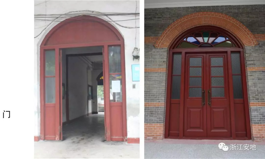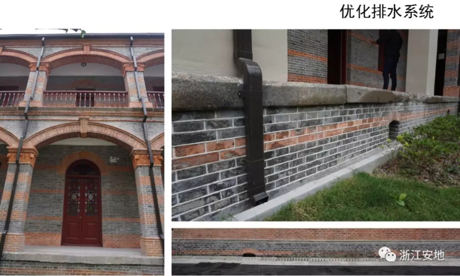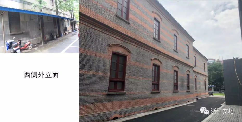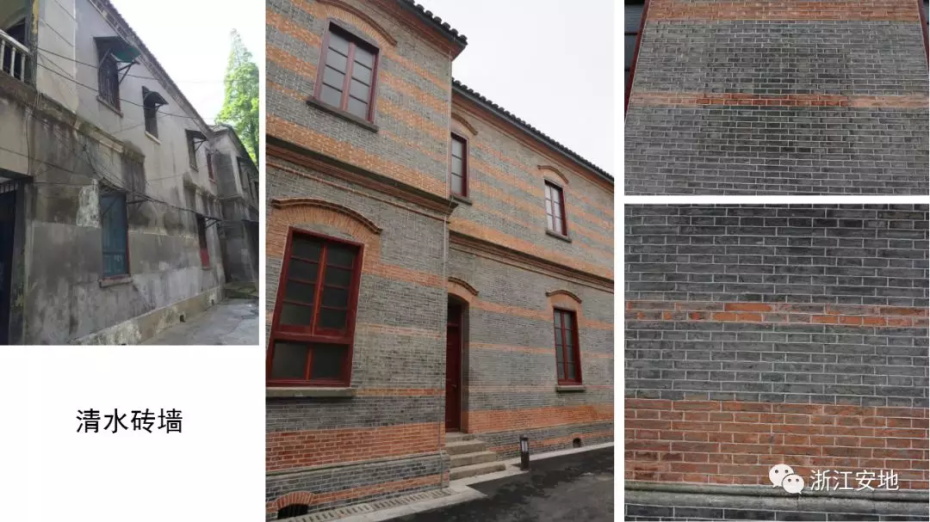 原有清水砖墙被水泥砂浆等覆盖,施工剥离时应小心剔除,避免对其产生二次损害;对保存完好的砖缝元宝缝进行保留,清理疏松及不具保留价值的砖缝,清缝后需小心清楚灰尘,按原有形制、材料重做勾缝;对严重风化的墙砖采用修复砖粉类材料进行修复,对色差处以拼色造旧处理;在修复后的墙面采用清水砖墙专用保护剂进行憎水防渗处理,以增强砖墙强度预防酥碱。