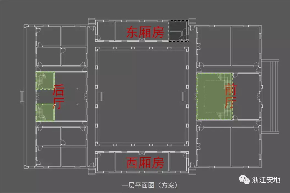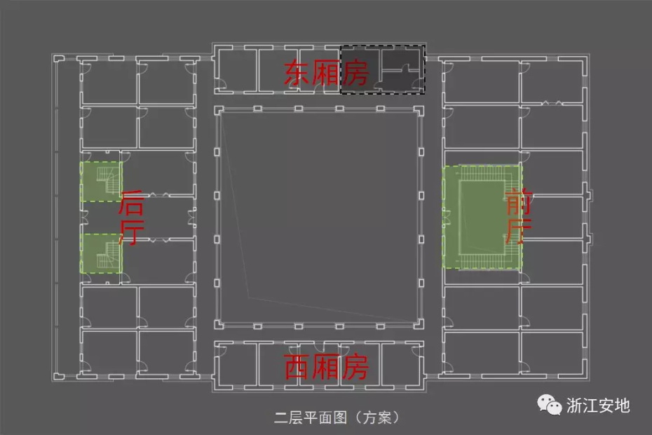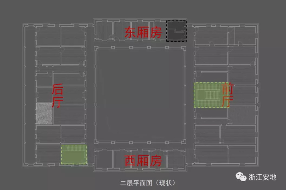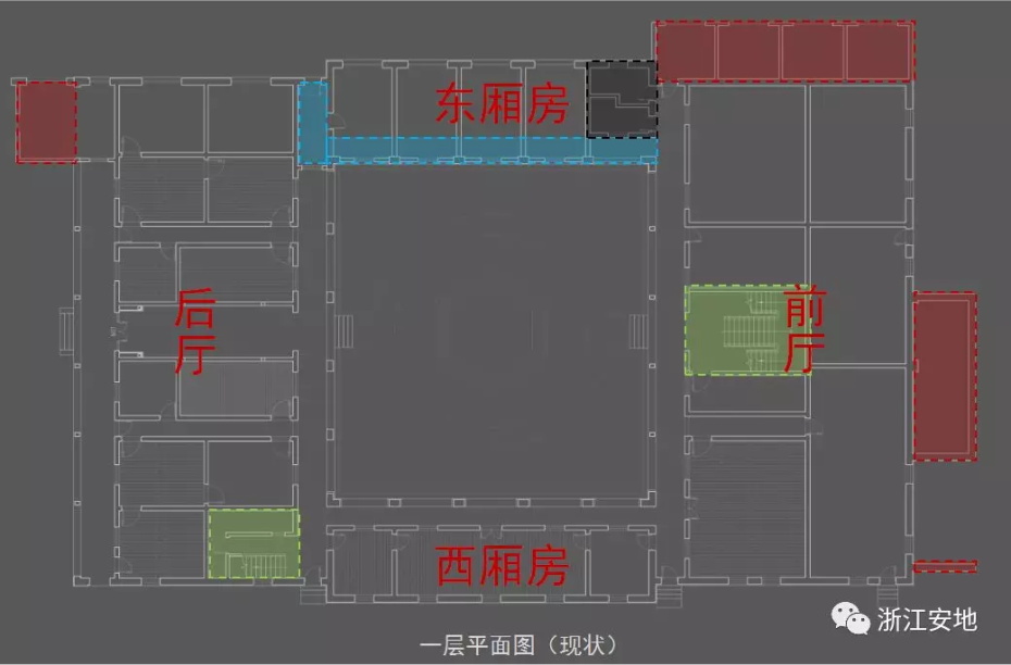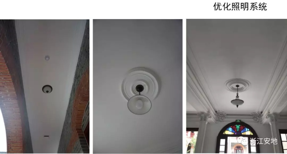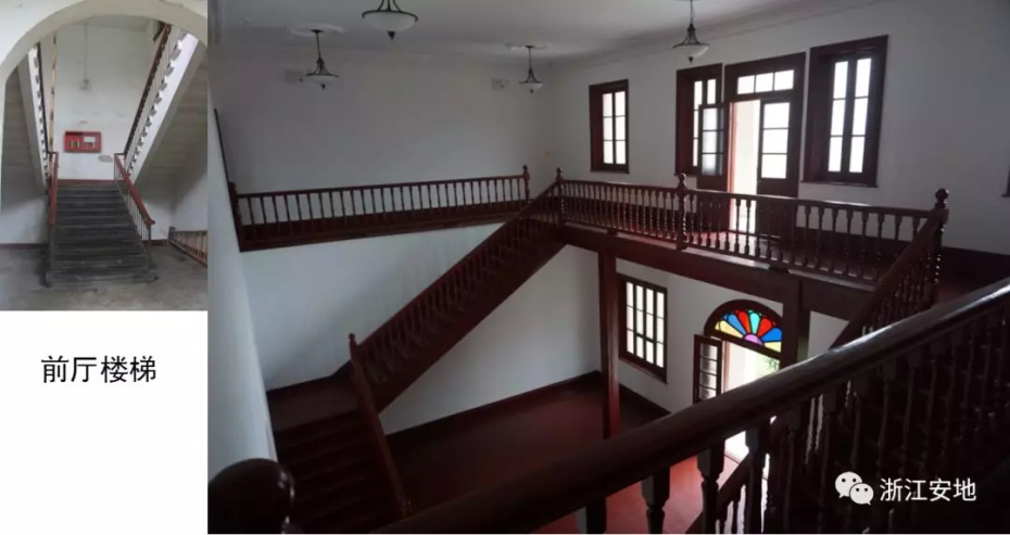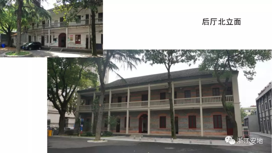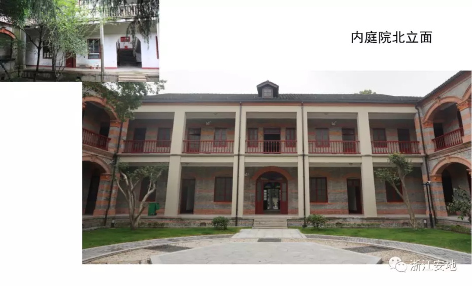 原有清水砖墙被水泥砂浆等覆盖,施工剥离时应小心剔除,避免对其产生二次损害;对保存完好的砖缝元宝缝进行保留,清理疏松及不具保留价值的砖缝,清缝后需小心清楚灰尘,按原有形制、材料重做勾缝;对严重风化的墙砖采用修复砖粉类材料进行修复,对色差处以拼色造旧处理;在修复后的墙面采用清水砖墙专用保护剂进行憎水防渗处理,以增强砖墙强度预防酥碱。