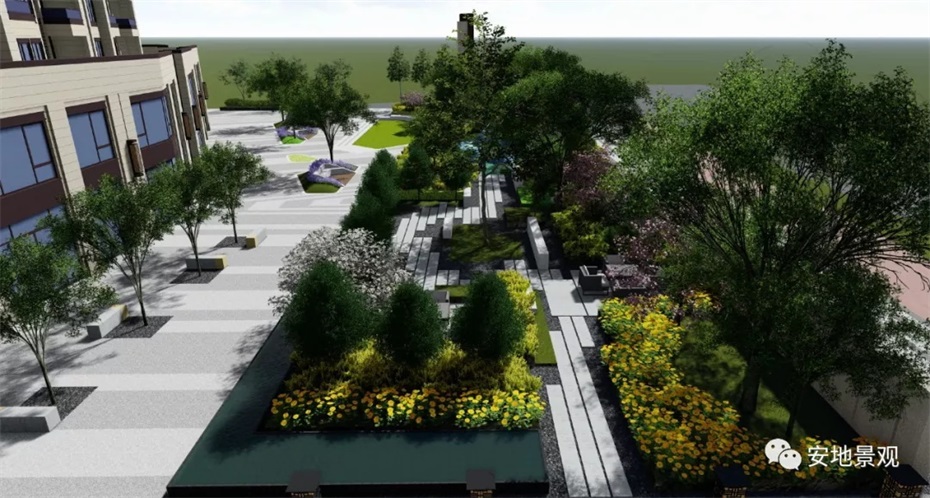 1.沿迎宾大道城市绿带,售楼处前广场,街头转角处设置精神堡垒,同时解决交通停车、组织销售活动、客人停留游憩等多种功能。