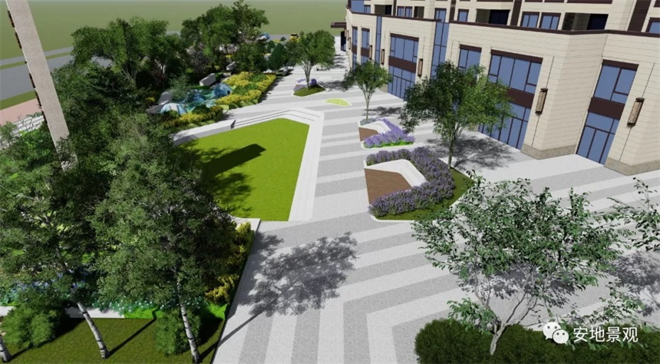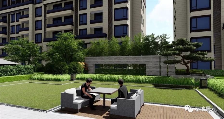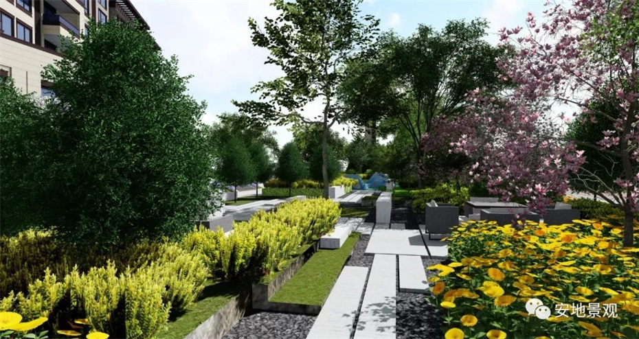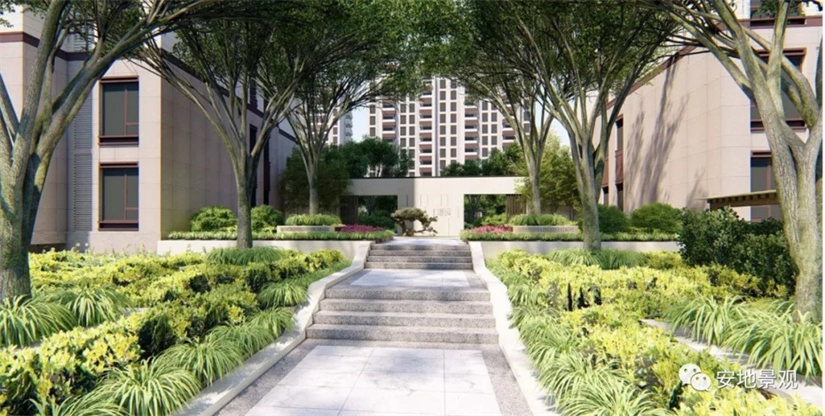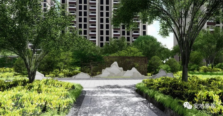 高层住宅区开放空间前的设置犹如屏风的片石对景,达到欲扬先抑的效果