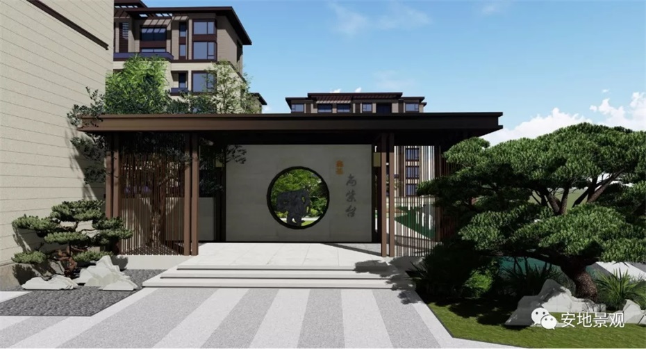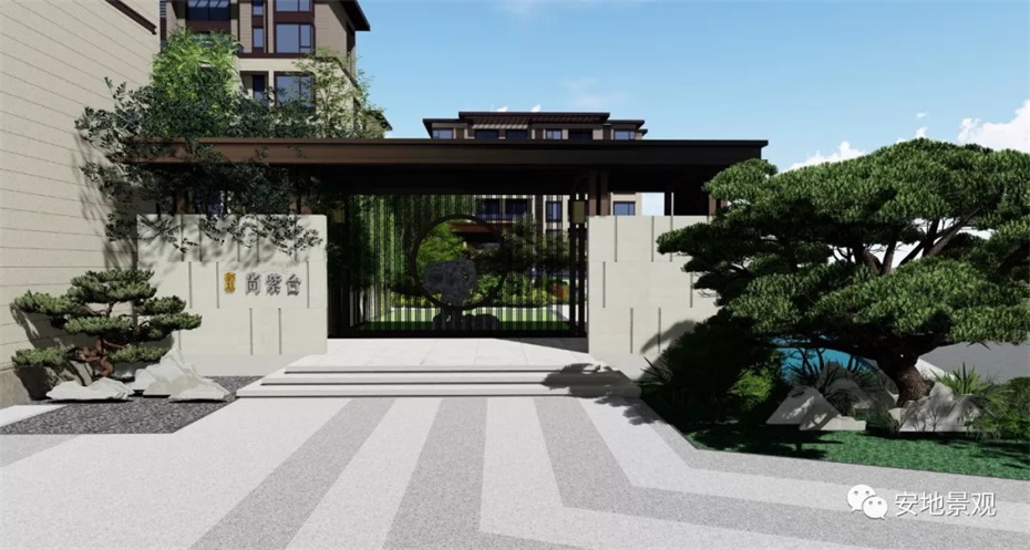 景观增加了框景,不仅套上了中式传统元素,而且解决了机动车入口处交通组织的难题