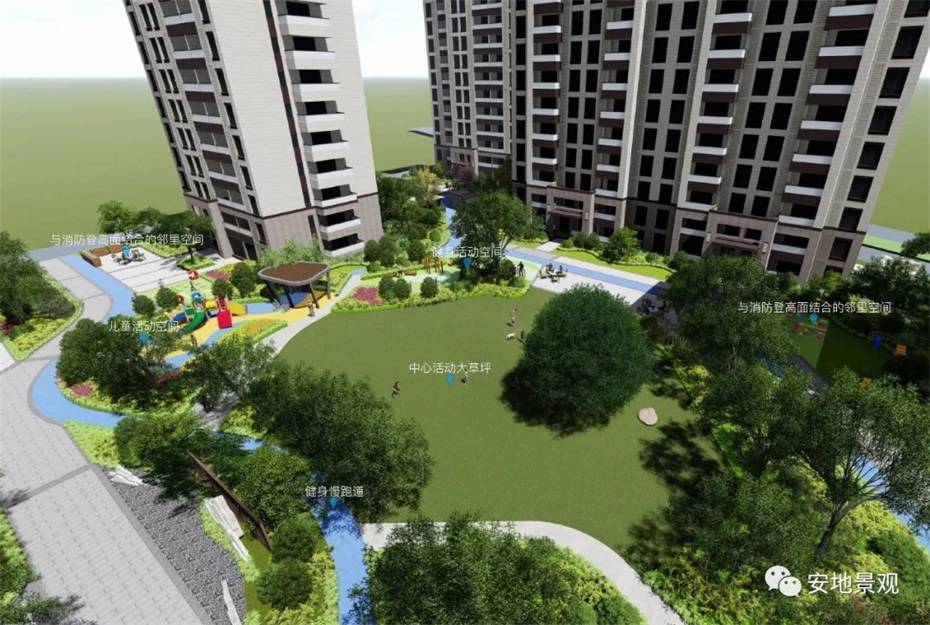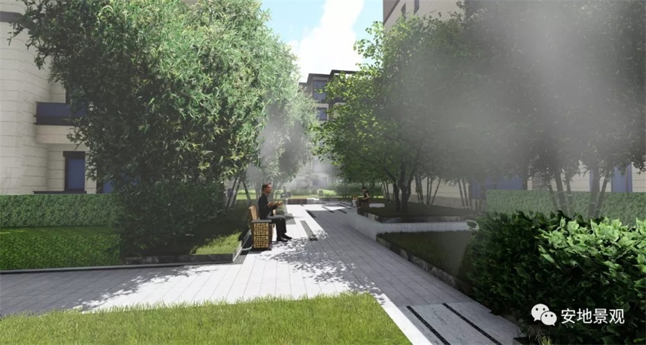 多层地库采光窗经过绿化围合,留出的空间能够提供休闲活动的场地