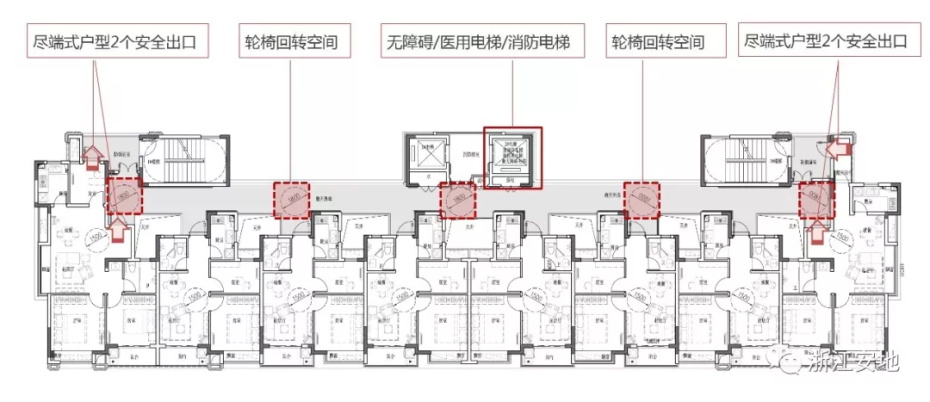 这18栋公寓设计之初,即结合了老年人规范及适老化标准,这种设计是自然的非刻意性的。通过“不露声色”的设计,让老年人家庭打消年龄歧视感和从人际关系中被分离出来的担忧;也为 “几代居”家庭的老人或者年轻主体在行动不便的情况下依然能维持原有的生活习惯和需求提供了方式。公共空间老年人照料适老化标准的运用: