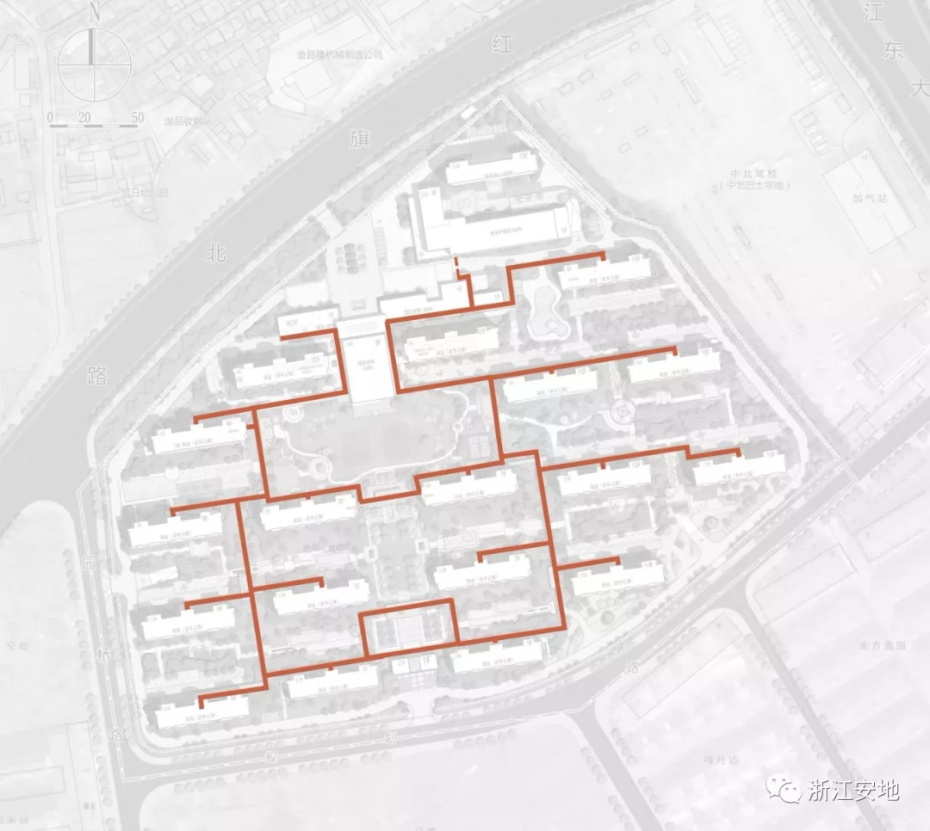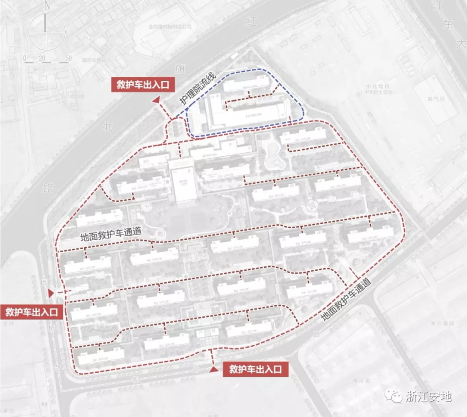 设计为了保证老年人出行安全,采用人车分流的交通组织方式。外圈设置环形车行系统,车辆日常通行不妨碍人流活动。此外社区内部则因高标准消防车道的布置,实现了救护车辆到户的需求。