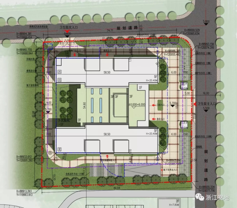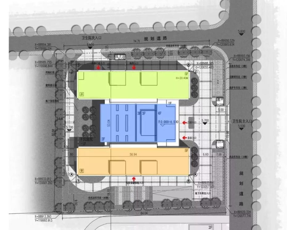 场地主入口朝东,设置人流最多的门诊出入口,入口角落设置急诊入口。公共大厅设有开敞楼梯,鼓励就近健康步行上下,可达每一层的门诊功能模块。