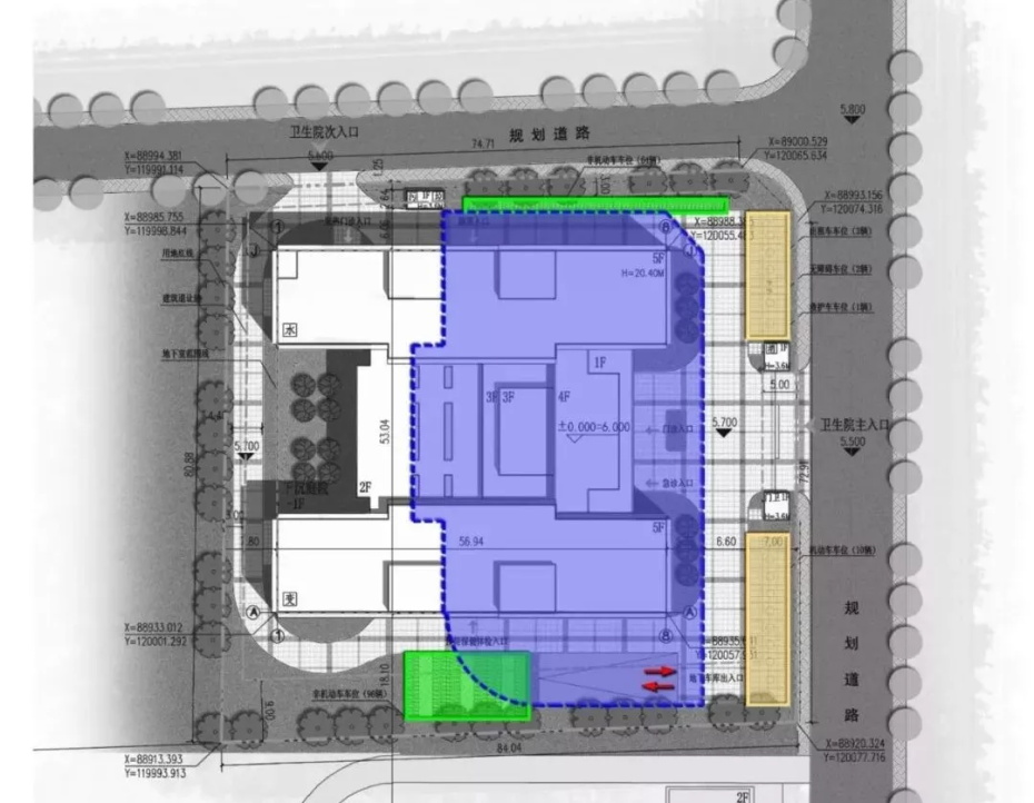 通过西北角场地次入口往里,为发热和肠道等隔离门诊模块。西北角为污物交通核,污物则通过污物电梯由地下室的污物垃圾站外运,做到洁污分流。