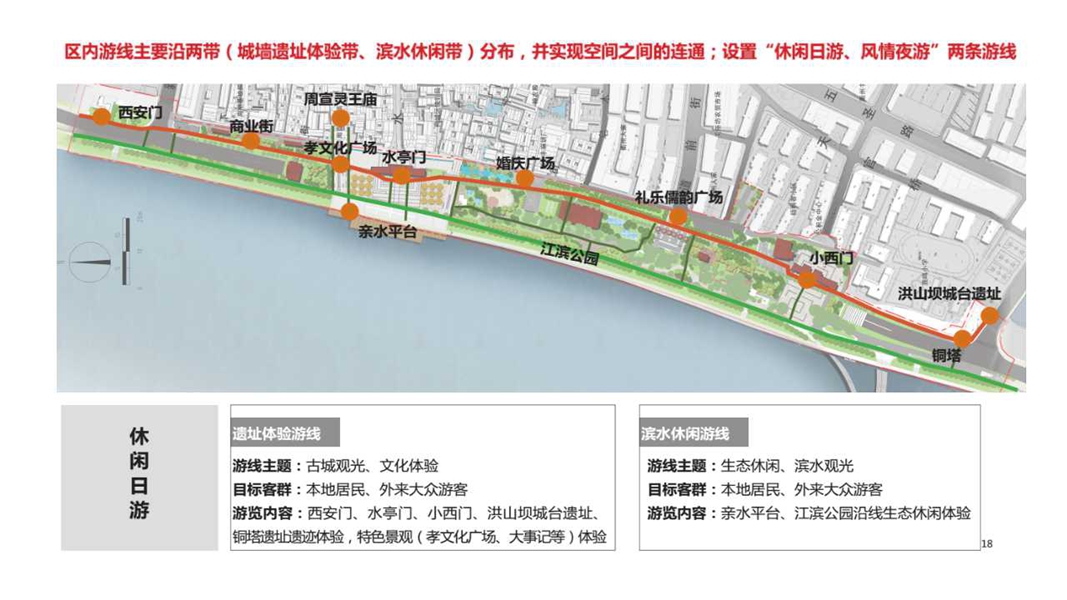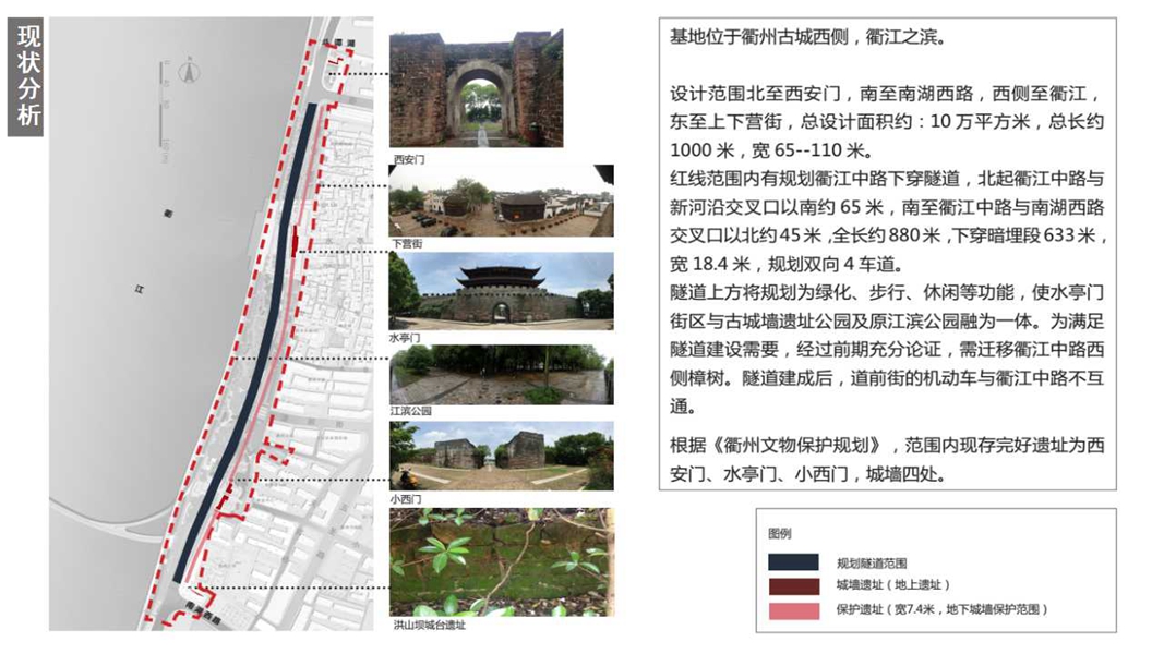 根据《衢州文物保护规划》内容,范围内现存完好遗址为西安门,水亭门、小西门、城墙、洪山坝遗址。各项功能活动被两条带(城墙遗址体验带、滨水休闲带)组织串联起来。