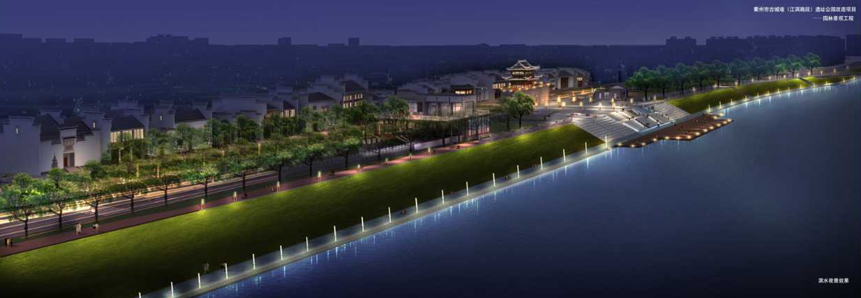 设计范围内有衢江中路下穿隧道,全长约为880米,下穿暗埋段633米,宽18.4米,双向4车道。隧道上方设计为绿化、步行、休闲等不同功能区域,使水门亭街区与古城墙遗址公园及原江滨公园融为一体。