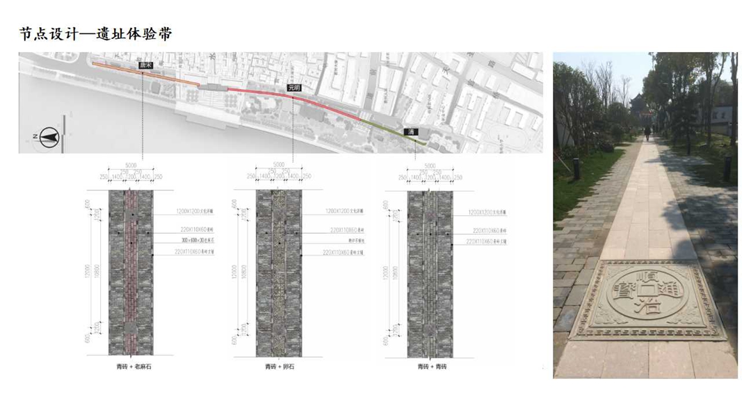 铺装材料以当地石材为主,以新铺装手法进行铺装; 主要贯通的园路做了600多米长的城墙遗址体验带;以不同的材质和铺装形式来区分(以老麻石和青砖条、卵石为主),表现城墙历史年代的更迭。镶嵌不同的地面浮雕,来讲述唐宋元明清不同的故事。