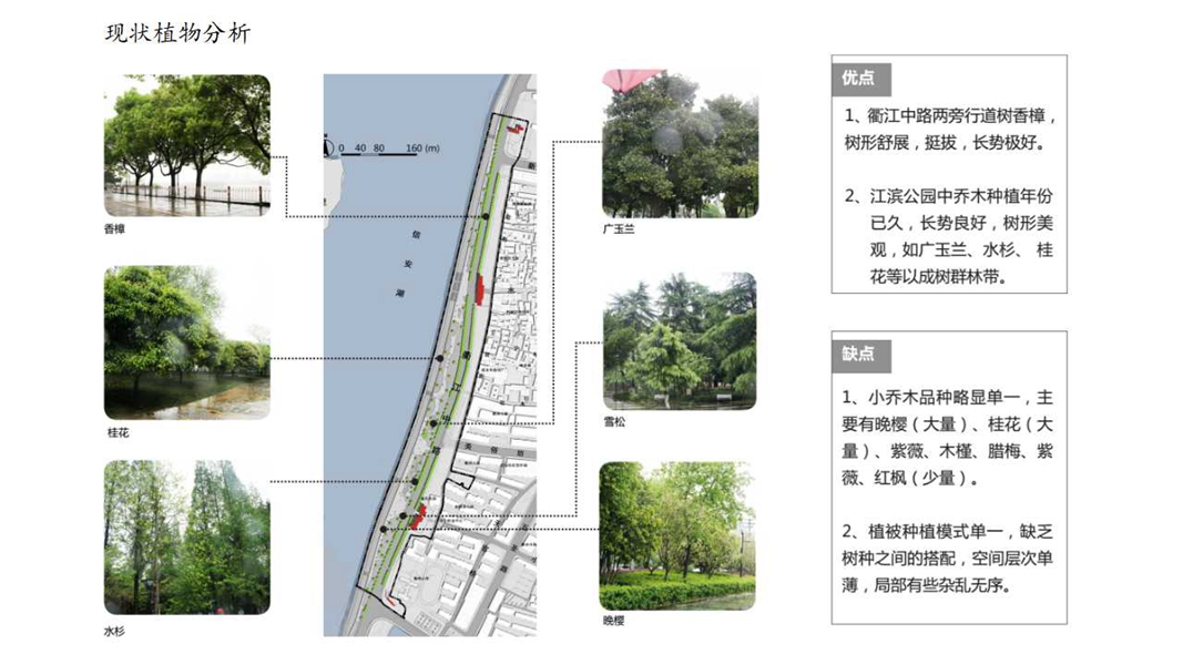 原江滨公园公园内部分树形优美长势良好的树种被保留,部分原江滨公园的构架也被一并保留。