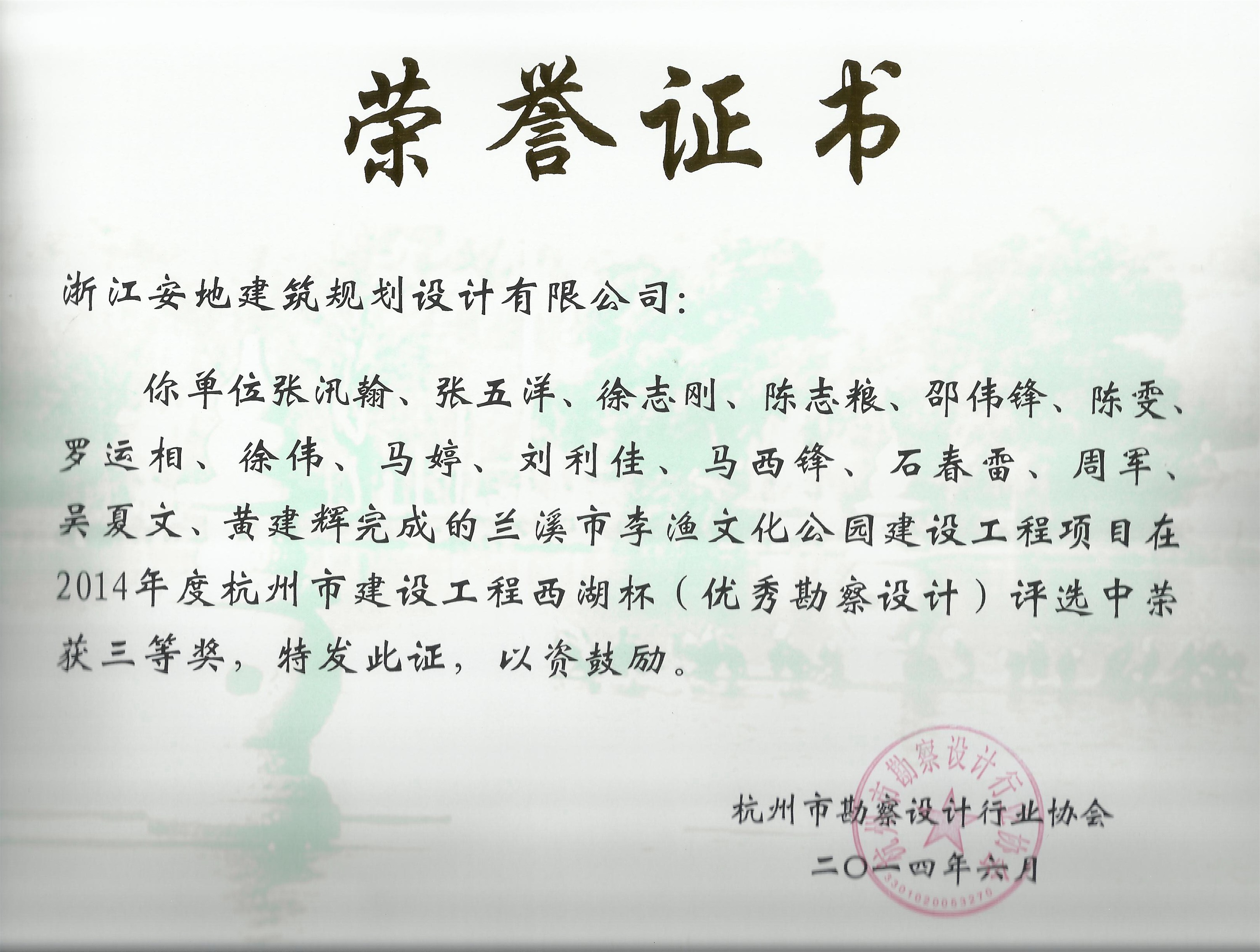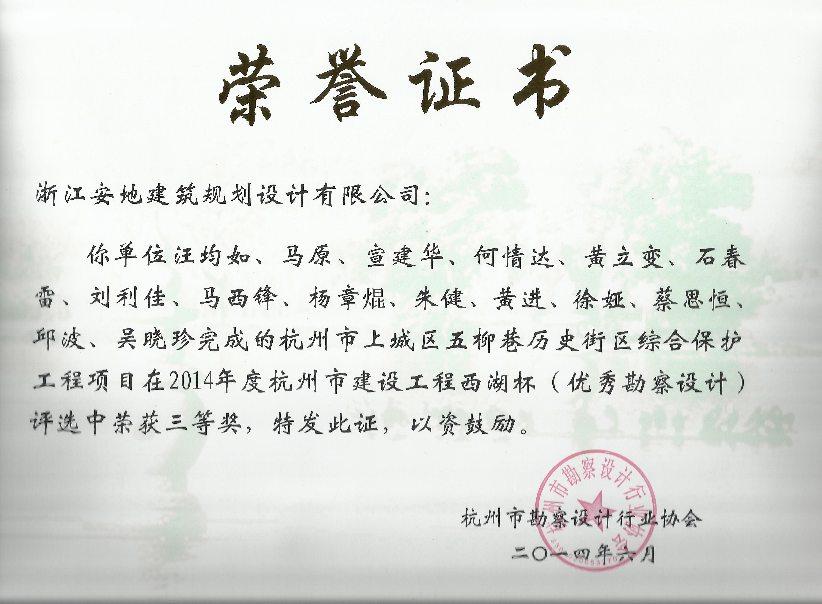 时间:2019-02-212014年度杭州市建设工程西湖杯(优秀勘察设计)三等奖